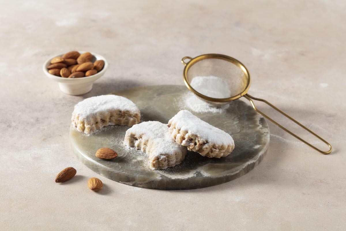 Buğday unu, tereyağı, badem, toz fındık ve pudra şekeri